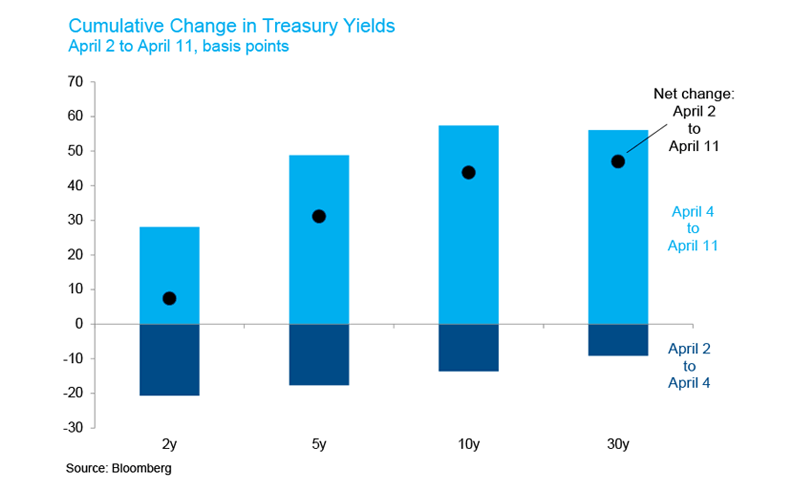 The rise in long-term Treasury yields last week surprised market participants and may have played a role in President Trump’s decision to temporarily pause the highest tariffs. The price action has been extreme: 10-year and 30-year Treasury yields registered their largest weekly increases since 2001 and 2008, respectively. It is indeed unusual and a bit unnerving to see Treasury yields rising by such magnitudes during a week that included a 12% equity drawdown and the VIX trading above 50. The yield curve bull steepened (yields falling most at the front end) on April 3 and 4 in the initial response to the tariff announcement. That was the reaction we would have expected to such a negative shock to sentiment and the growth outlook. Last week’s bear steepening reversed that expected pattern and then some. For the bond nerds out there, this bear steepening has the hallmarks of a real term premium shock, though it’s too early to draw firm conclusions.