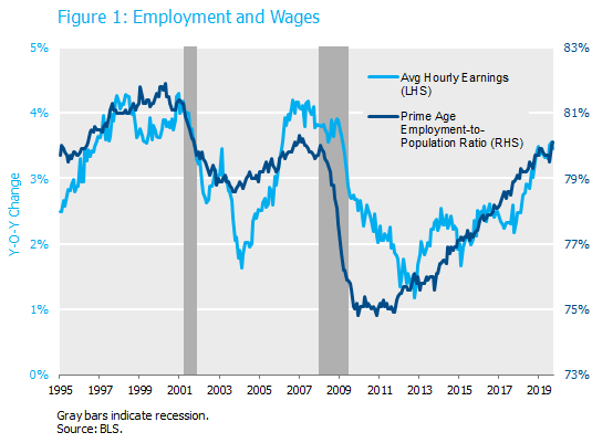 You’ve no doubt seen many of the well-known statistics describing today’s exceptionally strong labor market. The unemployment rate is at a 50-year low and there are currently more job openings than unemployed persons in the United States. As shown in Figure 1, the prime age employment-to-population ratio has recently regained its peak from the previous cycle and wage growth has broken above the 3% level for the first time in a decade.